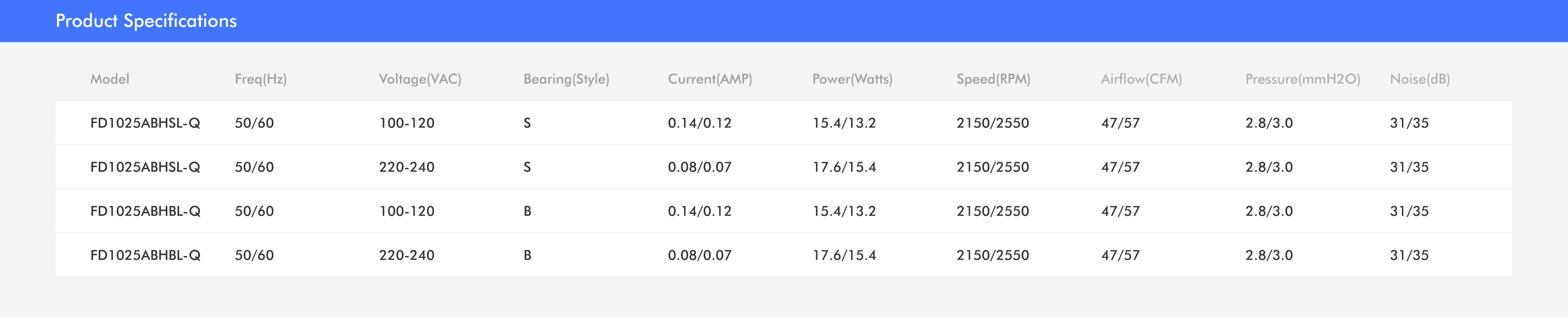 - Life at 25°C: Ball bearing 60,000 hours, Sleeve bearing 30,000 hours