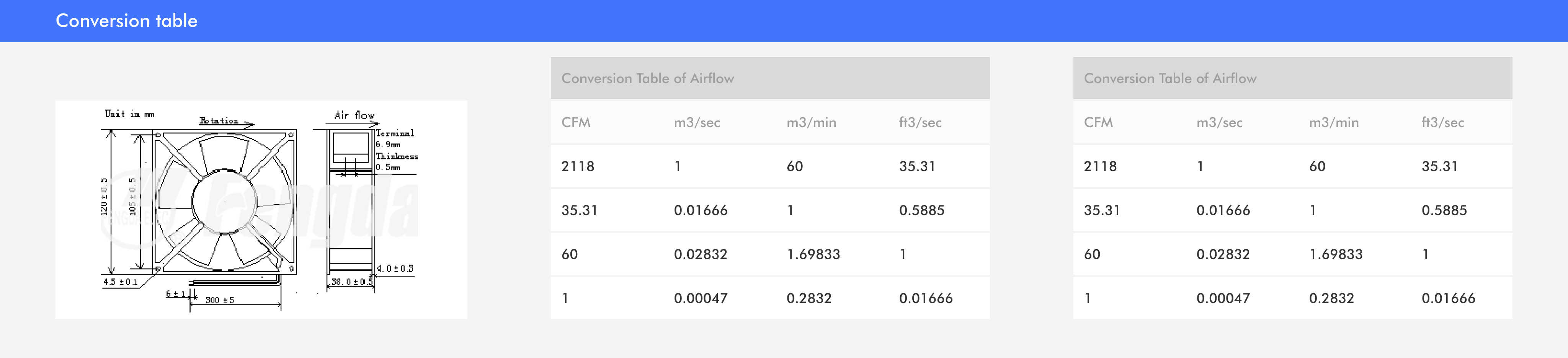 - Life at 25°C: Ball bearing 60,000 hours, Sleeve bearing 30,000 hours, Ball + Sleeve Bearing 45,000 hours