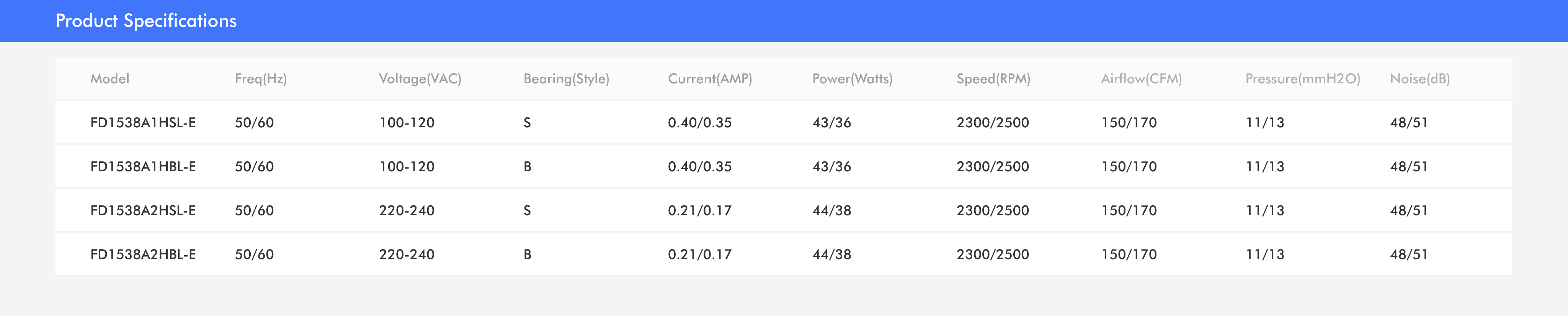 - Life at 25°C: Ball bearing 60,000 hours, Sleeve bearing 30,000 hours