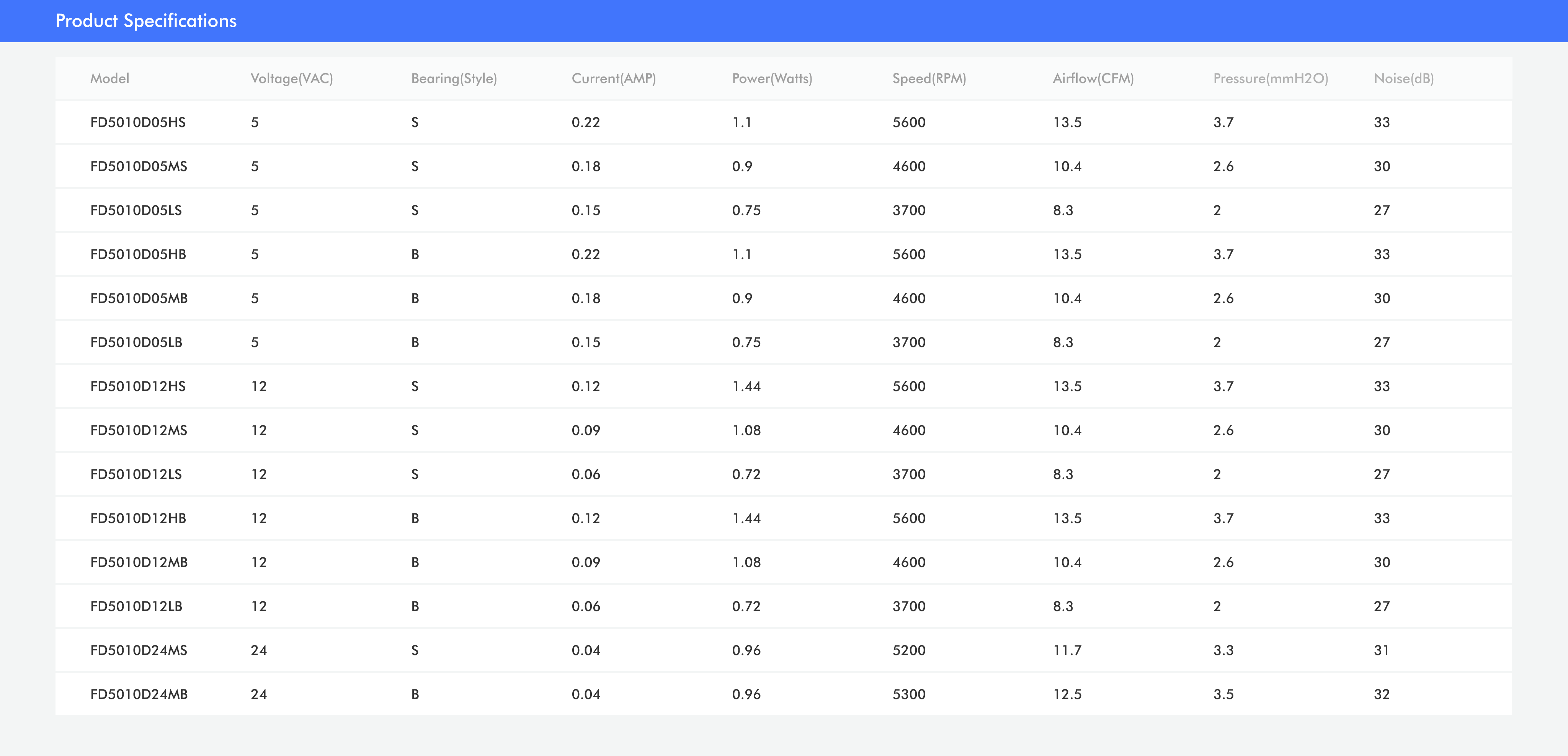 - S: Sleeve bearing B: Ball bearing