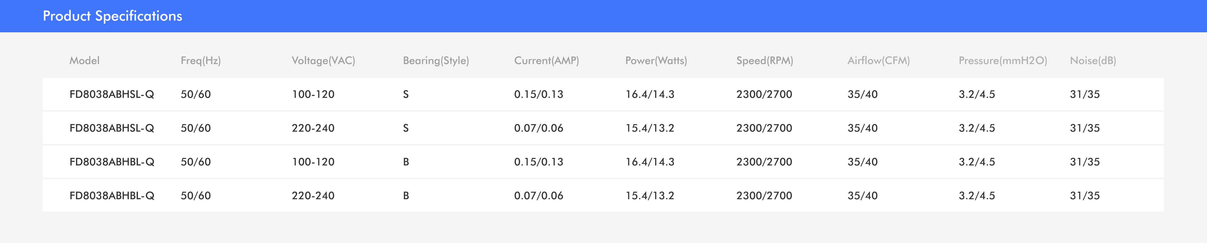 - S: Sleeve bearing B: Ball bearing